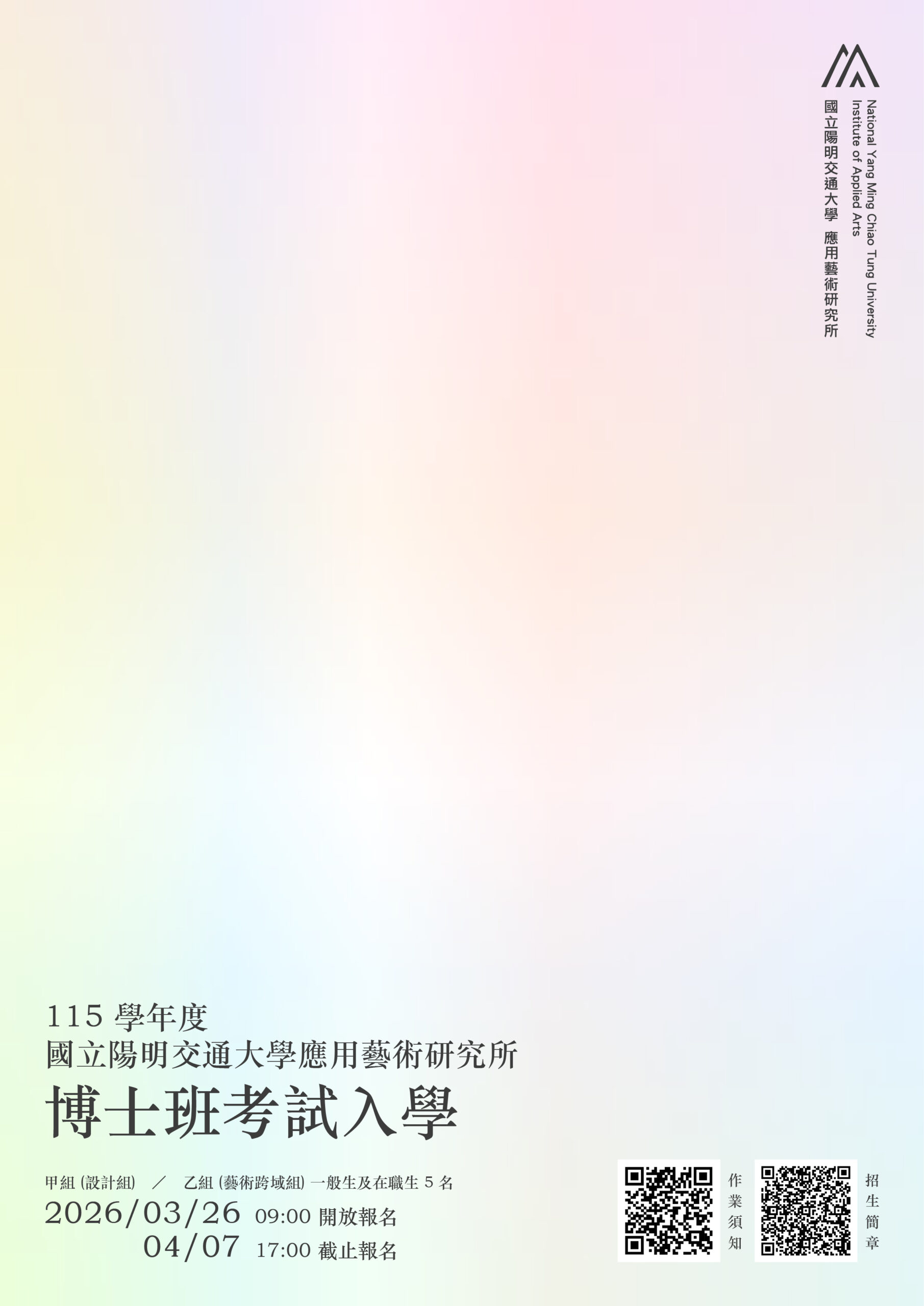 招生專區 組別與實驗室 設計組 — 主要培育具前瞻性之高級設計實務、設計工程、設計理論、設計企劃及電腦輔助設計 藝術跨域組 — 理論發展與創作實踐並重,透過科技、藝術與人文整合的觀點從事藝術跨域研究與創作。 碩士班甄試入學 - 國立陽明交通大學 應用藝術研究所 碩士班甄試 甲組主修設計:7名(含在職生) 乙組主修藝術跨域:6名(含在職生) 博士班考試入學 - 國立陽明交通大學 應用藝術研究所 本所博士班共分兩組: 甲組主修設計、乙組主修藝術跨域。 考生必須於報名時在報名類別之主修領域(A.甲組、B.乙組)中選填一組(不得報名多組),做為筆試、審查、口試及錄取後分組之依據。考生錄取後不得轉組。 碩士班考試入學 - 國立陽明交通大學 應用藝術研究所 碩士班考試入學 甲組主修設計:4名(含在職生) 乙組主修藝術跨域:5名(含在職生) 國立陽明交通大學 招生訊息 招生六大亮點 頂尖加倍 台灣首度兩所國立頂尖大學合併,結合原陽明大學生醫領域及原交通大學理工領域的領 […]