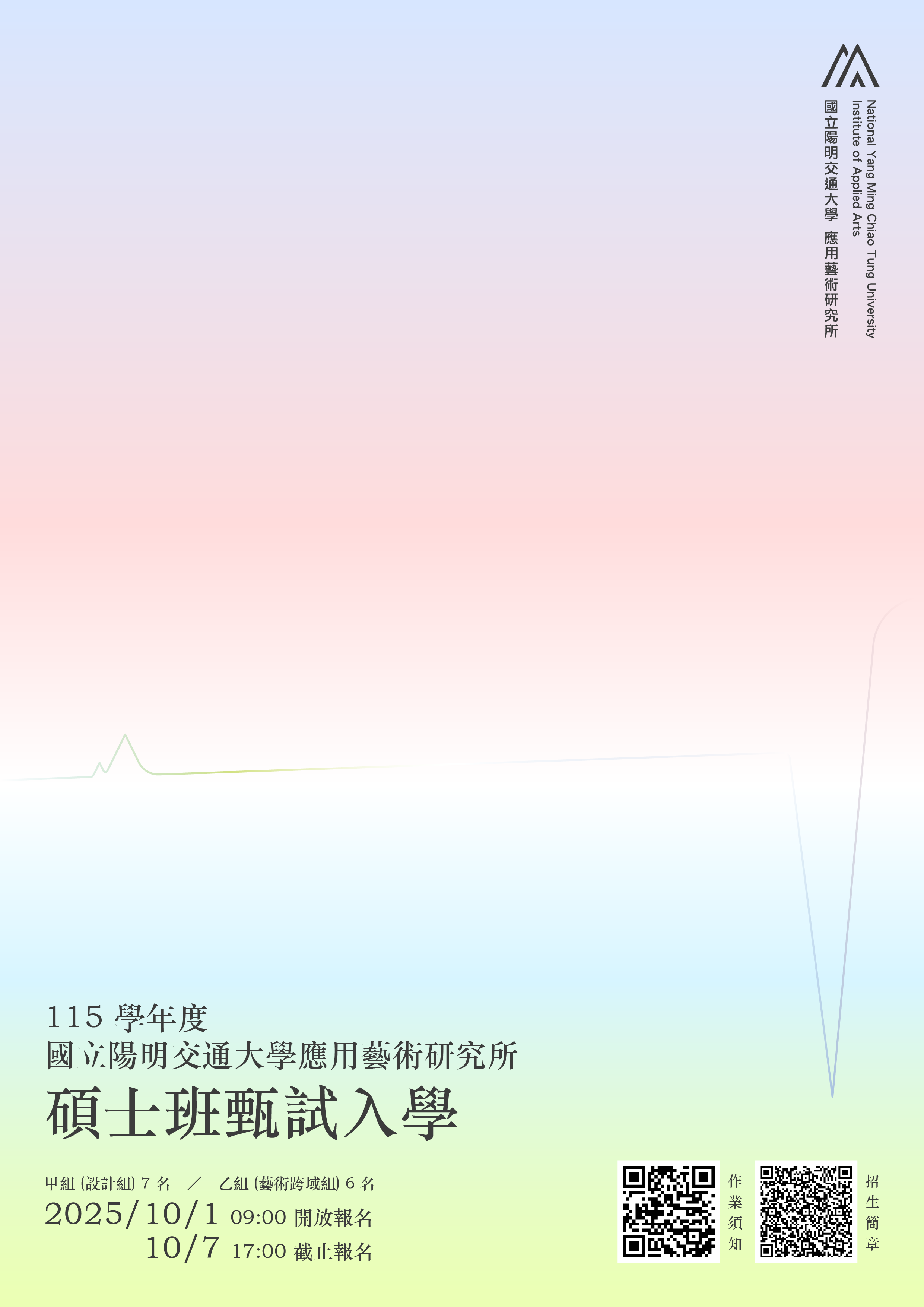 招生專區 組別與實驗室 設計組 — 主要培育具前瞻性之高級設計實務、設計工程、設計理論、設計企劃及電腦輔助設計 藝術跨域組 — 理論發展與創作實踐並重,透過科技、藝術與人文整合的觀點從事藝術跨域研究與創作。 碩士班甄試入學 - 國立陽明交通大學 應用藝術研究所 碩士班甄試 甲組主修設計:7名(含在職生) 乙組主修藝術跨域:6名(含在職生) 博士班考試入學 - 國立陽明交通大學 應用藝術研究所 本所博士班共分兩組: 甲組主修設計、乙組主修藝術跨域。 考生必須於報名時在報名類別之主修領域(A.甲組、B.乙組)中選填一組(不得報名多組),做為筆試、審查、口試及錄取後分組之依據。考生錄取後不得轉組。 碩士班考試入學 - 國立陽明交通大學 應用藝術研究所 碩士班考試入學 甲組主修設計:4名(含在職生) 乙組主修藝術跨域:4名(含在職生) 國立陽明交通大學 招生訊息 招生六大亮點 頂尖加倍 台灣首度兩所國立頂尖大學合併,結合原陽明大學生醫領域及原交通大學理工領域的領 […]